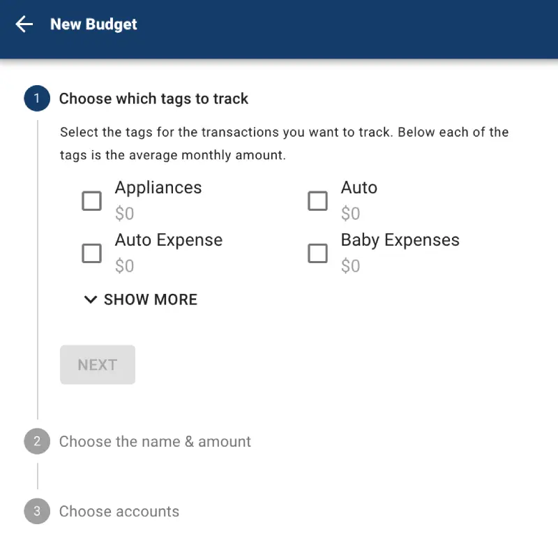 - Personalize your spending target by adding the monthly amount and item name (for example, Baby Expenses). You can choose the name, amount, tags, and accounts associated with this spending target.
